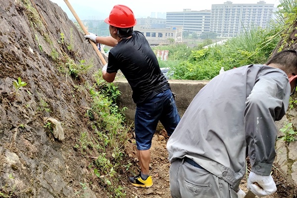 黨員們分工有序,有的彎腰割草,有的揮鋤刨根,有的拿鍬清沙,有的搬運雜物,大家精神飽滿干勁十足,充分發(fā)揚勞動最光榮、不怕臟、不怕苦、不怕累的作風,不放過每一個細節(jié)。高溫下干體力活,不一會兒人人都汗流浹背全身濕透。最辛苦是清理排洪溝沉降池的泥沙,要鏟到2米多高壩上很費體力。黨員們前赴后繼,輪流作業(yè)保證團隊戰(zhàn)斗力,“披荊斬棘除雜草,汗如雨下清溝渠”,呈現(xiàn)出一幅熱火朝天的勞動場景。經(jīng)過半天的辛勤付出,排水溝煥然一新,大家都滿滿的成就感和自豪感。