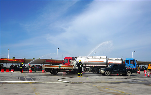 本次演練共有油桶滅火、危化車輛自燃施救、民爆車輛遭劫持時(shí)反劫持、易燃液體罐車碰撞泄漏施救等四個(gè)科目,共出動(dòng)演練人員近200人和參演車輛約20輛,主要檢驗(yàn)消防、公安、安監(jiān)、運(yùn)管等政府職能部門同社會(huì)應(yīng)急單位對(duì)道路危險(xiǎn)貨物運(yùn)輸突發(fā)事故處理的聯(lián)動(dòng)響應(yīng)程序、應(yīng)急救援技能和綜合協(xié)調(diào)水平。在現(xiàn)場(chǎng)總指揮的綜合協(xié)調(diào)下,演練過程有條不紊,井然有序,并達(dá)到預(yù)期效果。充分體現(xiàn)各道路運(yùn)輸單位牢固樹立以人為本、安全至上、安全發(fā)展的理念,各參演單位紛紛表示要認(rèn)真落實(shí)安全生產(chǎn)工作責(zé)任和全力做好道路運(yùn)輸安全生產(chǎn)工作。