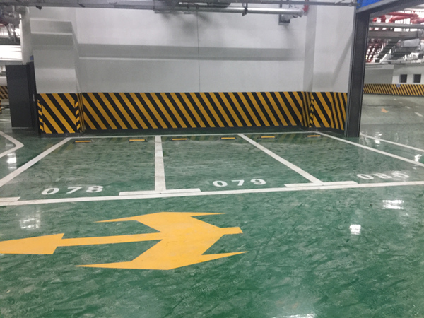 根據(jù)設(shè)計(jì)要求,牛山國際四期汽車泊位379個(gè),其中地上38個(gè),地下341個(gè)。地下室停車位中有209個(gè)機(jī)械停車位,132個(gè)自然停車位。停車位標(biāo)線及指示箭頭等劃線施工參照道路交通標(biāo)線標(biāo)準(zhǔn)、專用標(biāo)線涂料劃設(shè)。為了行車安全,還在坡道轉(zhuǎn)彎處安裝了安全凸鏡以方便觀察對面車況。